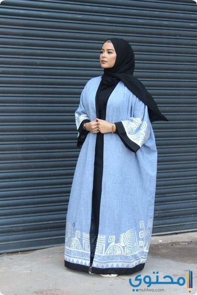 عباية من الستان لونها ابيض وعلى الأساور مزينة بقماش من الستان المشجر لونه ابيض في ازرق وفوقه طباعة من اللون الفضي.