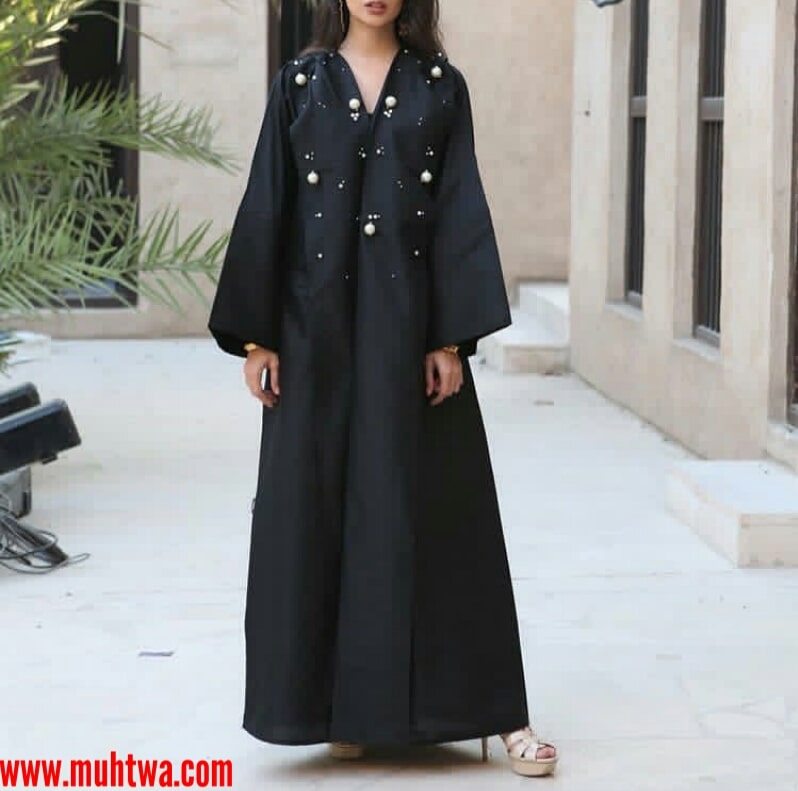 عباية باللون الأسود خليجية فضفاضة مفتوحة يمكن ارتداء بنطلون جينز تحتها ومنقوشة من على جانب الكتف والصدر.
