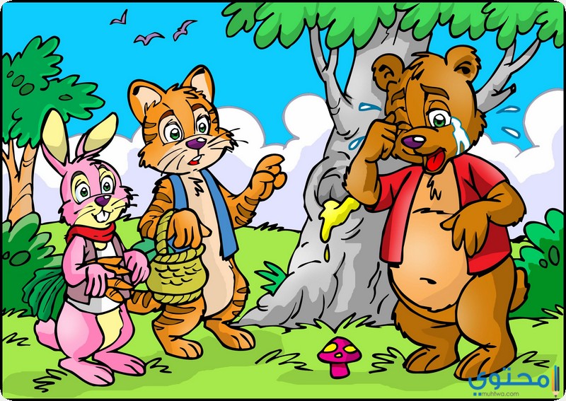 اتجهت الحيوانات نحوه في دهشة لتسأله عن سبب بكائه رغم وجود العسل، فقال لهم بحزن: لقد كان هنا ثعبان كبير يطارد فأراً وقام الثعبان بقذف السم على الفأر فأصاب العسل كله، وأنا الآن جوعان ولا يمكنني أن أكل لأن العسل أصبح كله مُسمم.