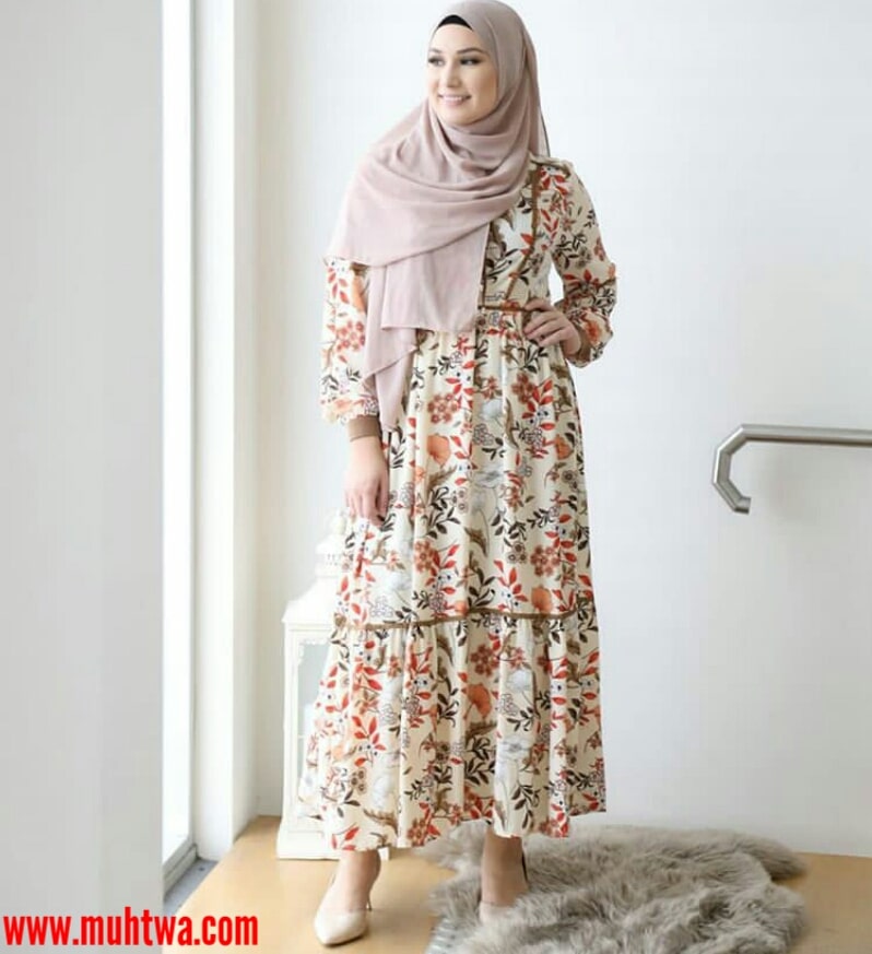 فستان أنيق جدا للمحجبات وهو فستان طويل وواسع بأكمام واسعة كما أنه مصنوع من القماش الشيفون الناعم باللون الأبيض ومنقوش عليه نقشات من الورود باللون البرتقالى الفاتح فى الاسود والروز الفاتح والأزرق والرمادي والكافيه.