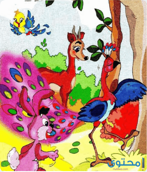 ثم تابع حديثه ناظراً الى الحمار: ألم ترى من قبل أن جلدك في غاية القبح وشكلك مثير للضحك؟ أما أنا.. أما أنا، انظروا الى جمالي، حزنت الحيوانات بشدة من كلام الطاووس، تدخل الحصان في الكلام وقال: يكفيك غروراً أيها الطاووس، فنحن الخيول لا احد يستطيع انكار جمالنا، ورغم ذلك لا نفعل مثلك.