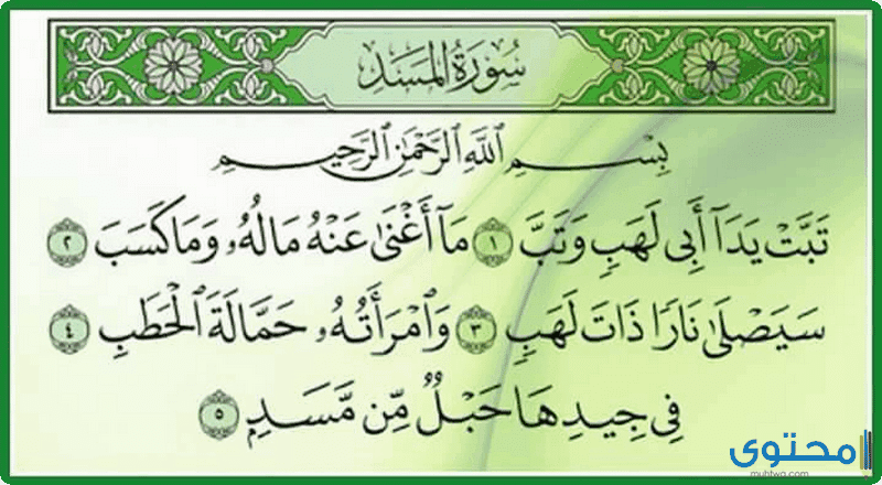 فضل قراءة سورة المسد والدروس المستفادة منها عبر موقع محتوى, سورة المسد من قصار سور القرآن الكريم حيث أن عدد آياتها 5 آيات وهي في الجزء الثلاثين من المصحف الشريف، نزلت هذه السورة العظيمة في مكة المكرمة بعد سورة الفتح مباشرة، وأطلق على هذه السورة اسم سورة تبت، وهذه السورة نزلت في حق أبو لهب وزوجته وفيها تهديد ووعيد تابعنا لمعرفة أسباب نزول السورة والدروس المستفادة من قراءتها.