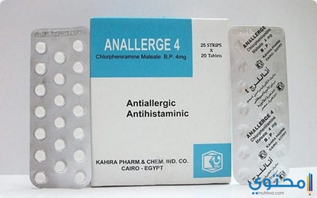 اناليرج 4 Anallege4 لعلاج الحساسية من خلال موقع محتوى, يستخدم عقار اناليرج4 لعلاج الحساسية فهو يحتوى على مادة كلورفينامين وهي من المواد المضادة للهستامين والتي تخفف من أعراض الحساسية مثل سيلان الأنف والحكة والسعال.