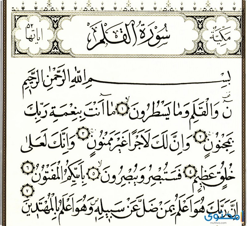 فوائد تربوية نتعلمها من سورة القلم عبر موقع محتوى, سورة القلم سورة مكية تقع في الجزء التاسع والعشرين من القرآن الكريم وهي ثاني سور هذا الجزء وهذه السورة رقمها ثمانية وستون وفقا لترتيب المصحف العثماني أما عن عدد آياتها الشريفة عددها اثنتان وخمسون آية,يطلق على هذه السورة اسم سورة القلم والسبب في هذه التسمية هو أن الله عز وجل أقسم في مطلع السورة بالقلم وفي هذا بيان لعظمة القلم واهميته في حياتنا.