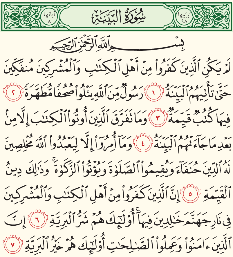 فضل سورة البينة وجزاء المؤمنين والكافرين في الاخرة عبر موقع محتوى, سورة البينة ترتيبها في المصحف العثماني هو الثامنة والتسعين وعدد اياتها ثمانية تقع هذه السورة بعد سورة القدر وبعدها سورة الزلزلة وهي بالجزء الثلاثين من القرآن الكريم، ويذكر ان هذه السورة العظيمة نزلت بعد الهجرة النبوية الشريفة كما يختلف العلماء عما اذا كانت هذه السورة العظيمة مكية ام مدنية.
