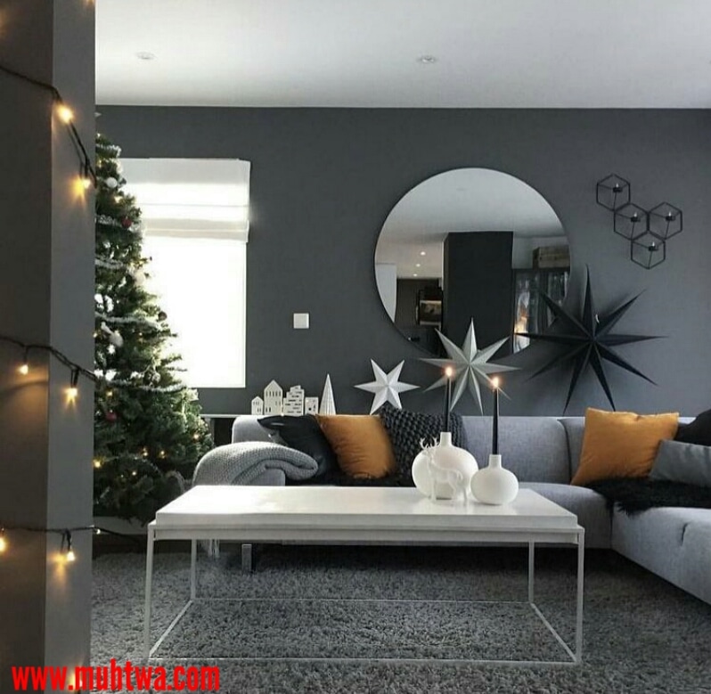 اذا كنتى من اصحاب الشخصيات الهادئة فاليكي هذا الديكور حيث اعتمدوا على اللون الرمادى الداكن فى دهان الحائط مع انتريه حديث بذات الدرجة مع سجادة دائرية الشكل.