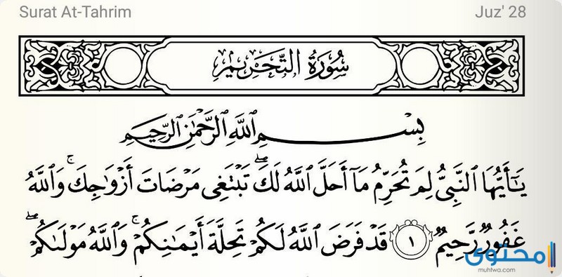 أهم الدروس المستفادة من تلاوة سورة التحريم عبر موقع محتوى, سورة التحريم هي السورة السادسة والستون من القرآن الكريم وعدد آياتها اثني عشر آية وتقع هذه السورة العظيمة في نهاية الجزء الثامن والعشرين من القرآن الكريم، هي سورة مدنية نزلت على سيدنا رسول الله صل الله عليه وآله وسلم في المدينة المنورة، تحدثت هذه السورة العظيمة عن الجهاد في سبيل الله كما تتطرق السورة إلى العديد من الأمور الهامة تابع معنا السطور التالية لمعرفة بعض أسرار سورة التحريم وسبب تسميتها بهذا الإسم.