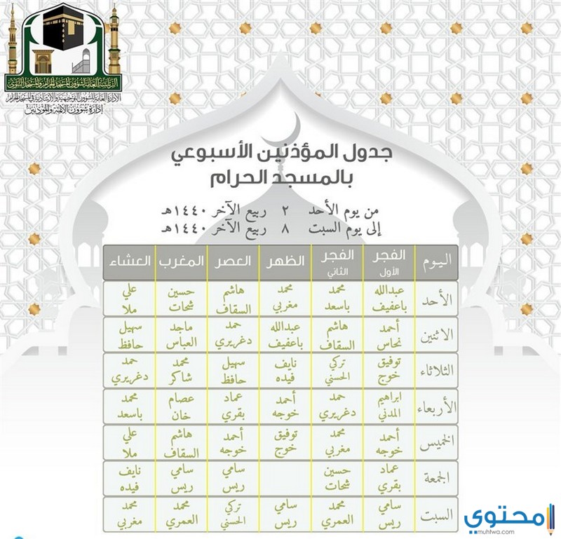 - كما تضع الإدارة العامة لشؤون الائمة والمؤذنين جدول لحركة المؤذنين وتنظيم كل البدائل لهم ومتابعة جدول الائمة بشكل اسبوعي.