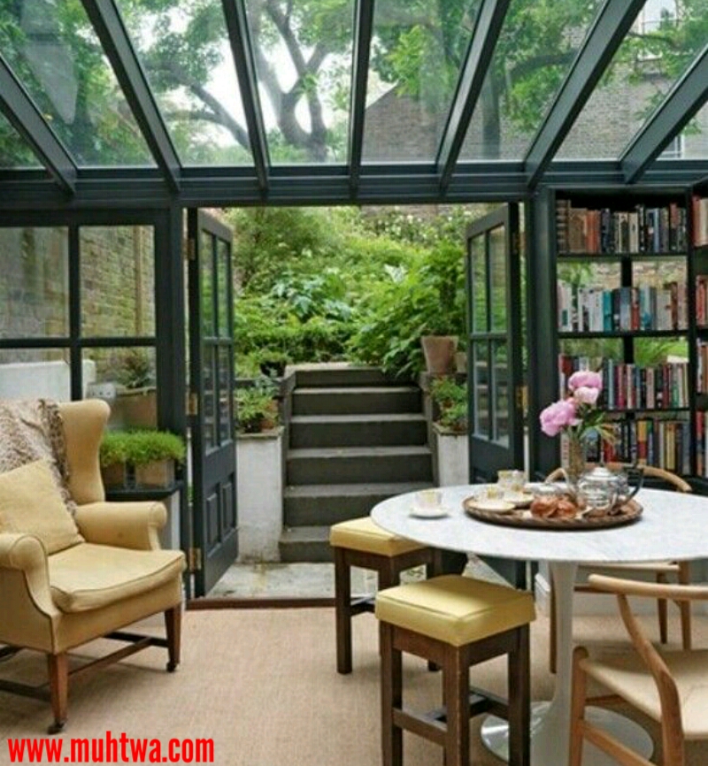 ديكور تراس غاية فى الأناقة يناسب أصحاب المنازل الكبيرة يحتوى على نوافذ زجاجية مع كنبة منجدة للاسترخاء وطاولة بسيطة من الخشب.