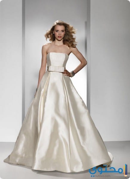 فستان طويل واسع منفوش ساده به بعض الأكسسوار في الخصر بلا أكمام مكشوف الصدر .